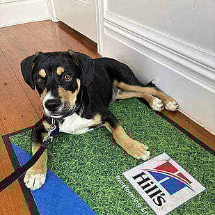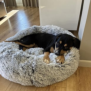 He’s a clever boy who’s already picked up “sit” and is doing really well on the lead. He learns quickly and is eager to please - especially if treats are involved (which he definitely loves). At his recent vet visit, he was so relaxed he just lay there happily munching away while getting his jabs.