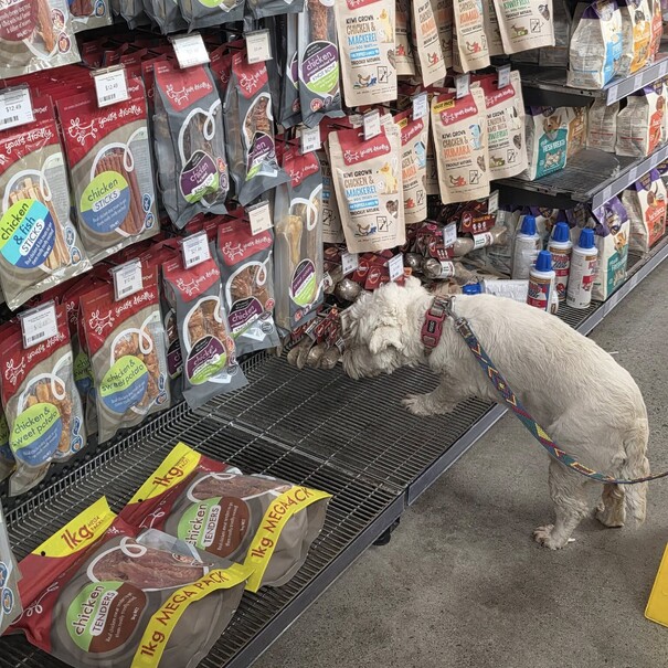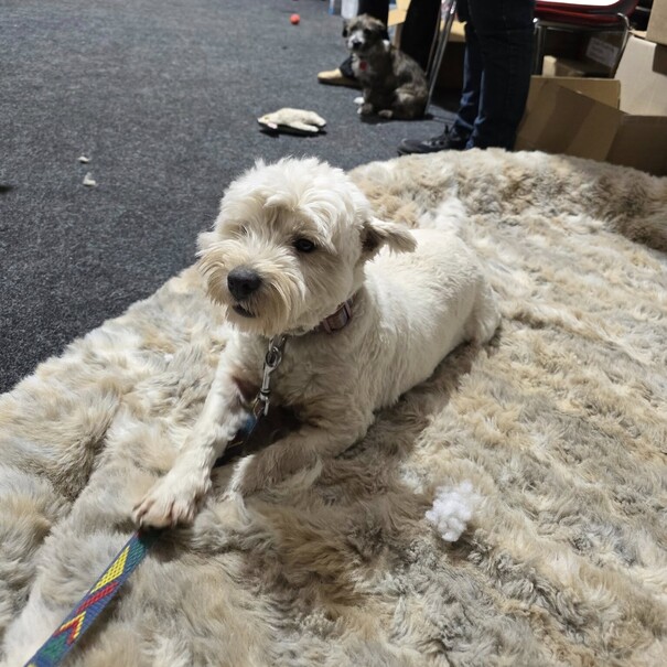 Briefly speed-dated the resident dogs through the crate — formal introductions coming soon.